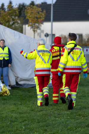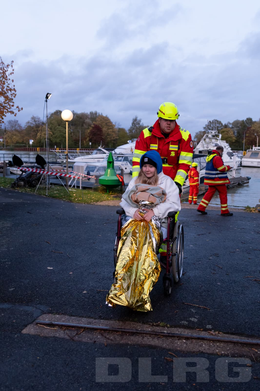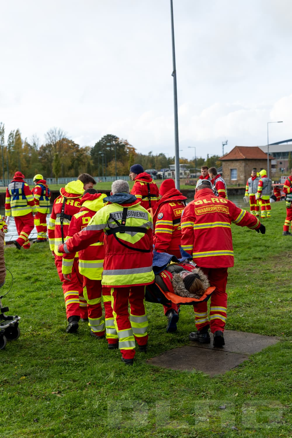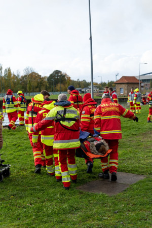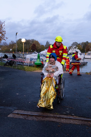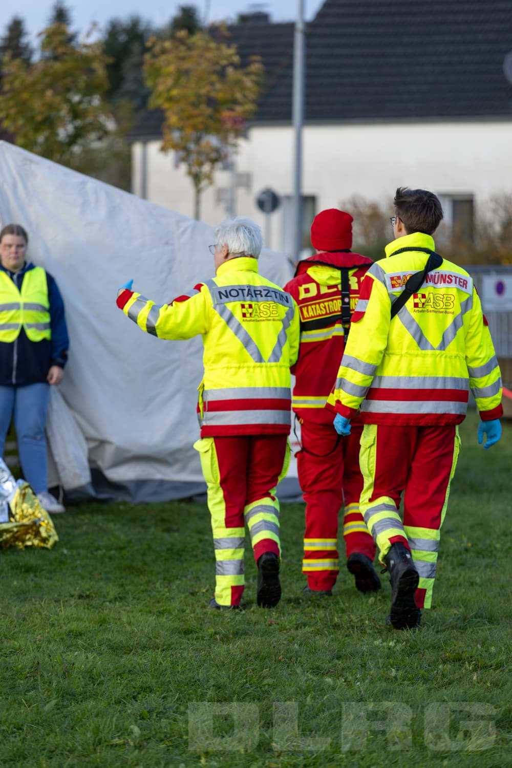 Das Übungsszenario stellte die Einsatzkräfte vor eine realistische Herausforderung: Nach massiven Regenfällen musste eine Notunterkunft in einem überfluteten Gebiet evakuiert werden – der Zugang war nur noch über den Wasserweg möglich. Neben der Evakuierung der Bewohnerinnen und Bewohner galt es auch, verletzte Personen vor Ort medizinisch zu versorgen. Die geretteten Menschen wurden mit Booten an das sichere Ufer gebracht und dort vom ASB Münster betreut, der beim Yachtclub Monasteria eine Betreuungsstelle eingerichtet hatte.