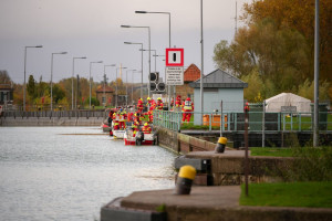 Ab 11:30 Uhr trafen die ersten Fahrzeuge im Sammelraum am Freibad Greven ein, wo das Führungsfahrzeug (Einsatzleitwagen, ELW) die eintreffenden Einheiten dokumentierte. Nach einem gemeinsamen Gruppenfoto formierte sich der Verband geschlossen und fuhr weiter nach Münster, wo die Steinfurter Kräfte auf die Kameradinnen und Kameraden des Bezirks Münster trafen. Zusammen bildeten sie einen Wasserrettungszug, der anschließend zur Übungsstelle am Kanal in Münster, im Bereich der alten Schleuse, verlegte.